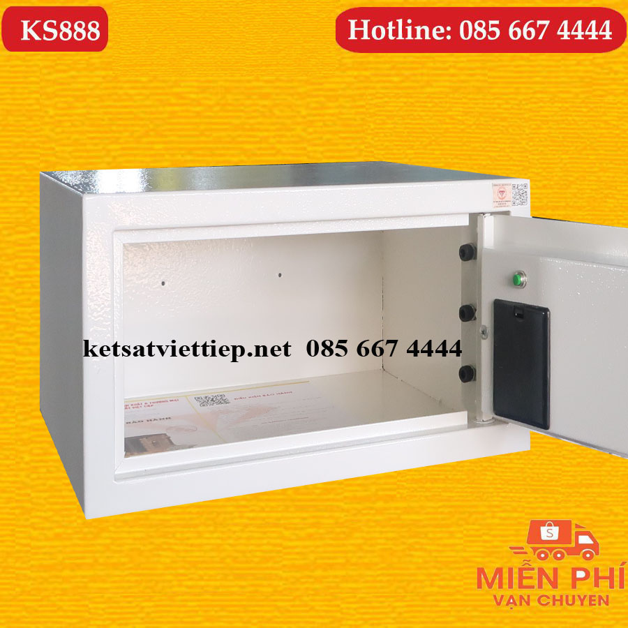 - Két sắt khách sạn Việt Tiệp KS888 được lắp đặt bộ khóa vân tay cao cấp tích hợp chế độ báo động. Chuông báo động sẽ được kích hoạt khi sản phẩm bị nhập sai vân tay quá 3 lần hoặc bị đập phá